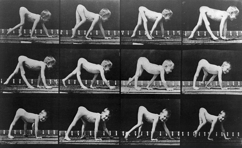 I didn’t realize Muybridge had a whole treatise on animal locomotion, connected to atypical mobility. Here’s his signature series style, with incremental shots in black and white of a child doing a bear-crawl walk.