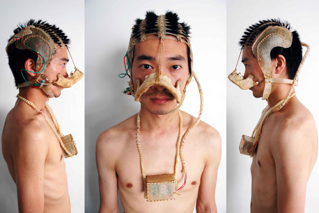Made of pig skin, human bones, and electronics, it's like an exoskeletal medical lesson. Like a physical system, unzipped and turned inside-out.